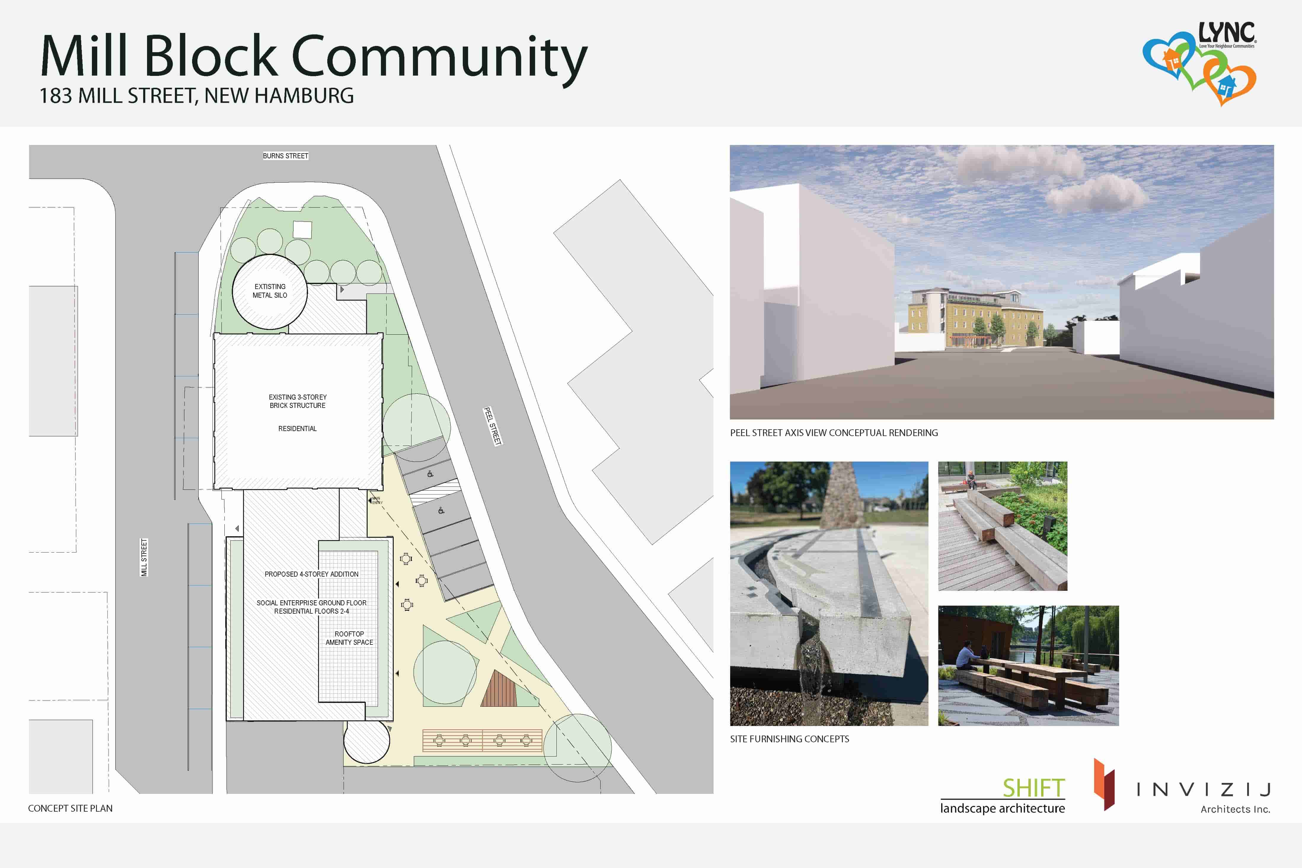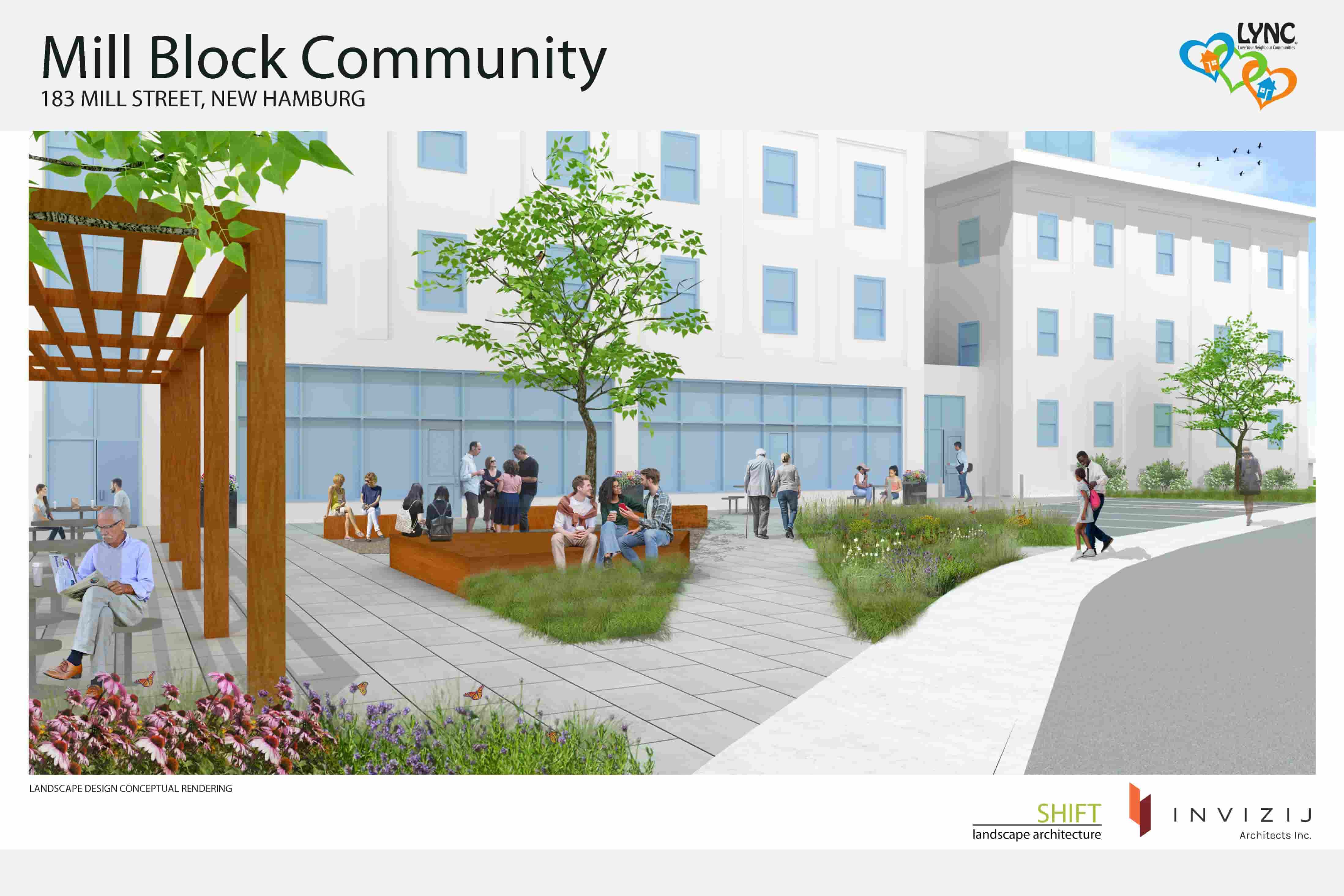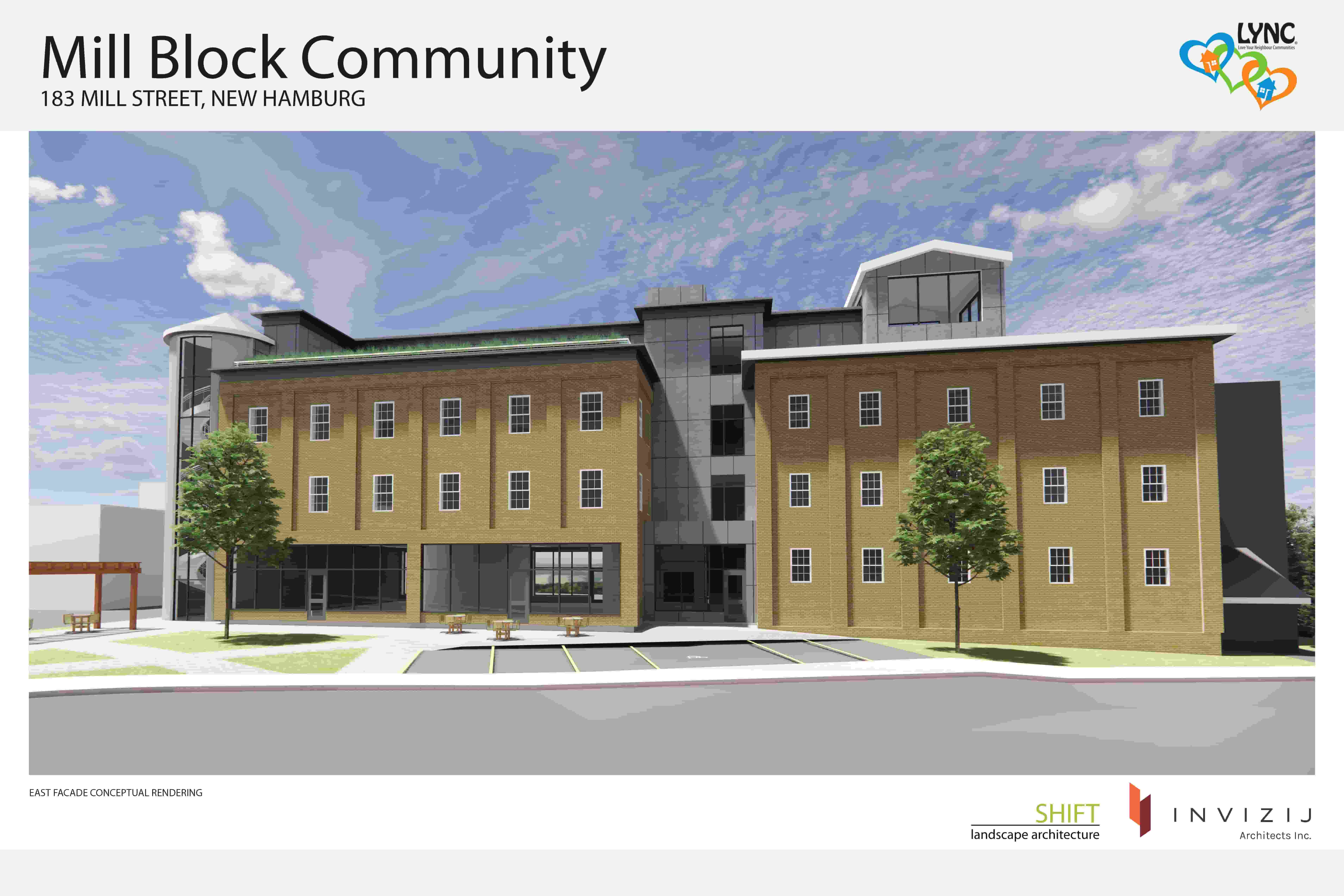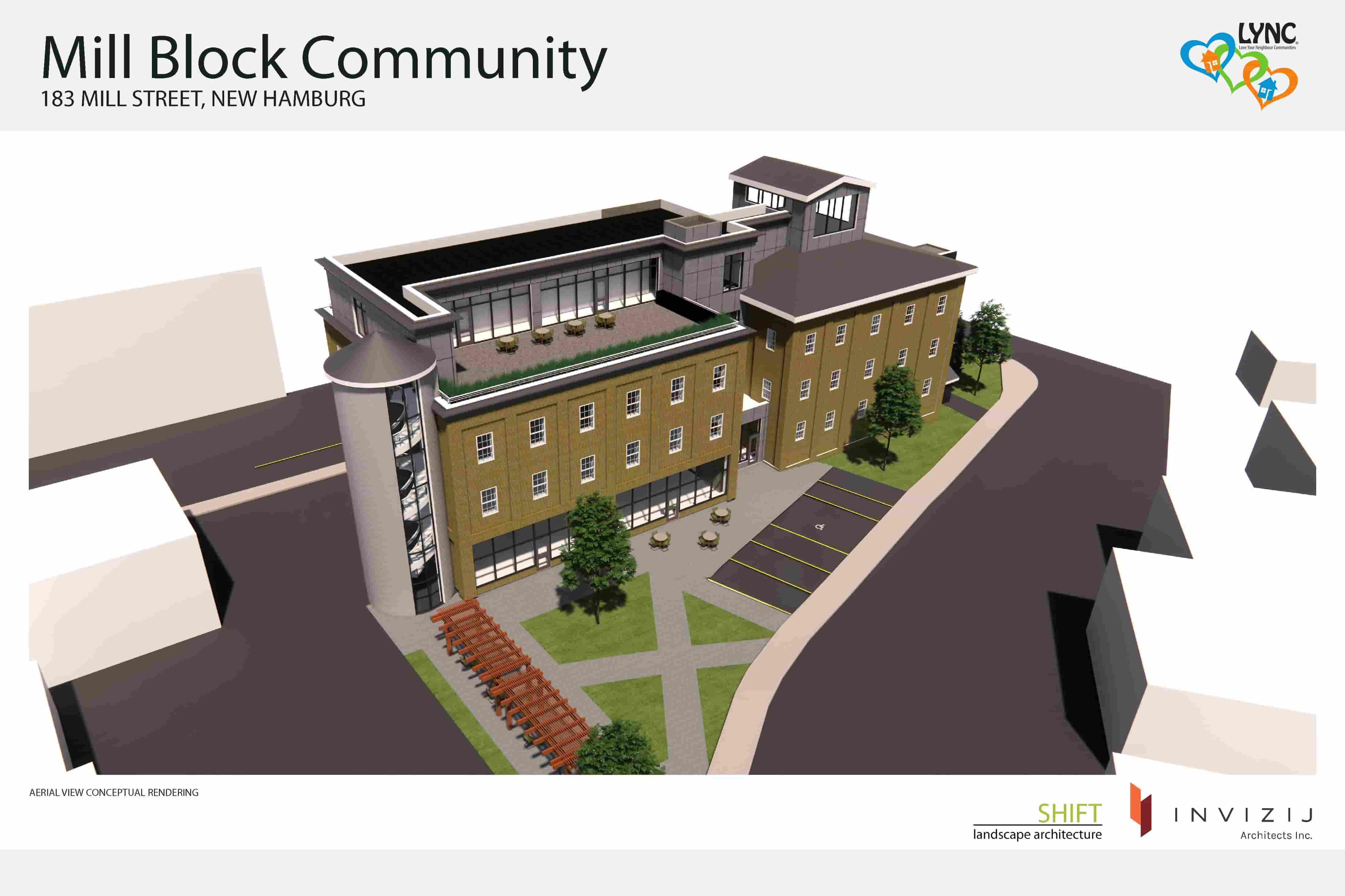 The MillBlock an intentional community of 17 affordable/14 market rent units planned for the historic mill in Wilmot providing housing for singles, families, seniors and people who are differently abled. The build includes inclusive social enterprise spaces- a community kitchen, meeting rooms and community gardens for programs and services. The build utilizes the mill’s structure avoiding embodied carbon impact of new construction. The build will use Canadian materials and will be energy efficient, carbon neutral with renewable energy/water conservation. The inclusive spaces will allow LYNC to develop services to meet practical needs of individuals and families through a comprehensive approach to the multifaceted challenges they face. Socially and economically disadvantaged communities will have relief from poverty, food insecurity and will be encouraged to develop their knowledge, skills, and the resources needed for long-term self-sufficiency. The Millblock is shovel ready with ownership, zoning, development team, construction manager and class B budget in place.